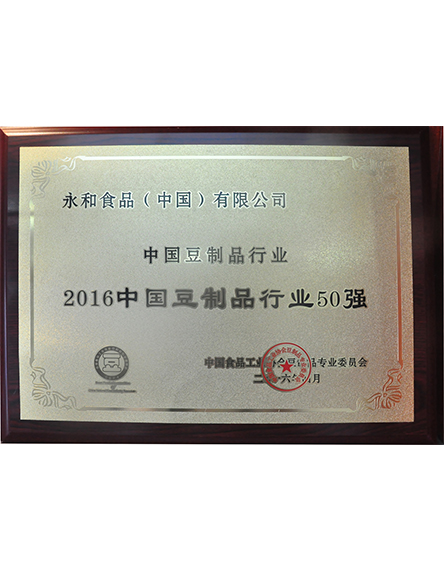 20164 月永和食品(中國(guó))有限公司榮獲2016中國(guó)豆制品行業(yè)50強(qiáng) -