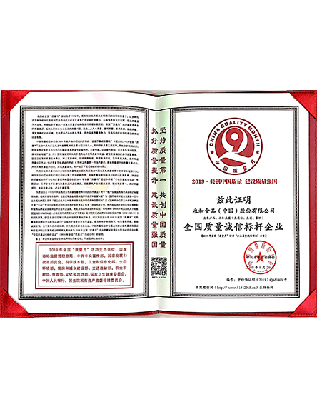 20199 月永和食品(中國(guó))股份有限公司榮獲2019全國(guó)質(zhì)量誠(chéng)信標(biāo)桿典型企業(yè) -