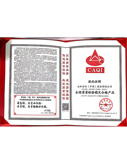20193 月永和食品(中國(guó))股份有限公司產(chǎn)品榮獲全國(guó)質(zhì)量穩(wěn)定檢驗(yàn)合格產(chǎn)品 -