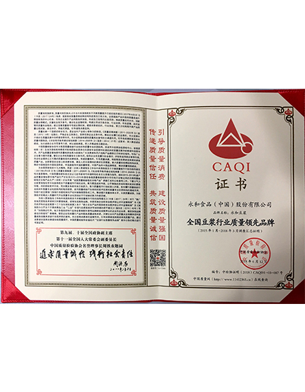20186 月永和食品(中國(guó))股份有限公司旗下品牌永和豆?jié){榮獲全國(guó)豆?jié){行業(yè)質(zhì)量領(lǐng)先品牌 -