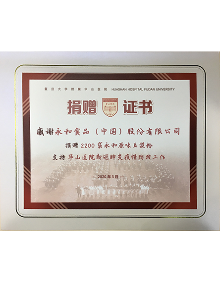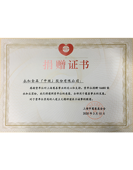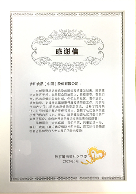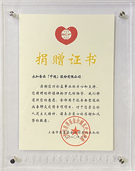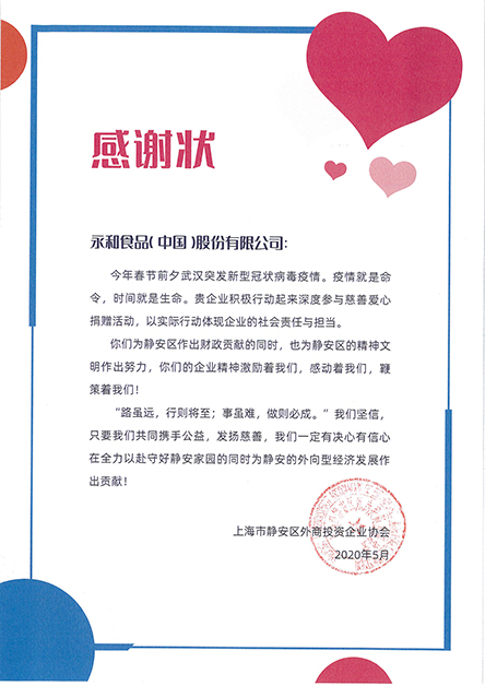 20205 月自2020疫情爆發(fā)以來(lái),永和食品(中國(guó))股份有限公司積極承擔(dān)企業(yè)責(zé)任,深度參與靜安區(qū)慈善愛心捐贈(zèng)活動(dòng),將愛心傳遞,為健康續(xù)航!上海市靜安區(qū)外商投資企業(yè)協(xié)會(huì)為此頒發(fā)感謝狀! -