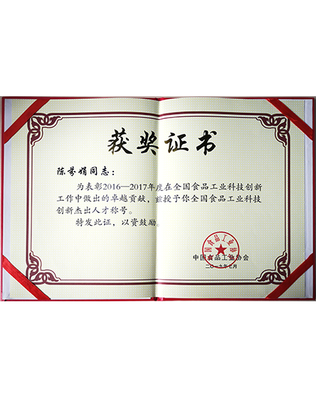 20197 月為表彰陳芬娟2016-2017年度在全國(guó)食品工業(yè)科技創(chuàng)新工作中做出的貢獻(xiàn),中國(guó)食品工業(yè)協(xié)會(huì)授予陳芬娟榮譽(yù)稱號(hào)和證書 -