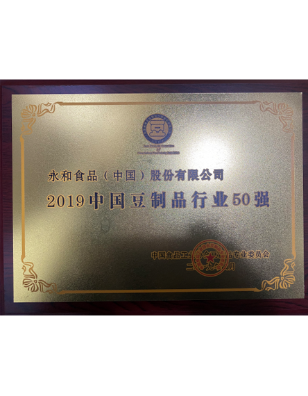 20194 月永和食品(中國(guó))股份有限公司榮獲2019中國(guó)豆制品行業(yè)50強(qiáng) -