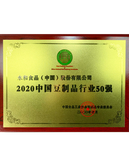 20204 月永和食品(中國(guó))股份有限公司榮獲2020中國(guó)豆制品行業(yè)50強(qiáng) -