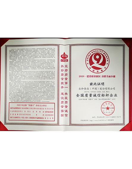 20209 月永和食品(中國(guó))股份有限公司榮獲全國(guó)質(zhì)量誠(chéng)信標(biāo)桿企業(yè)稱號(hào) -