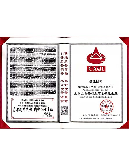 20219 月永和食品(中國(guó))股份有限公司榮獲全國(guó)豆制品行業(yè)質(zhì)量領(lǐng)先企業(yè) -