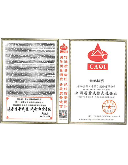 20233 月永和食品(中國(guó))股份有限公司榮獲全國(guó)產(chǎn)品和服務(wù)質(zhì)量誠(chéng)信示范企業(yè) -