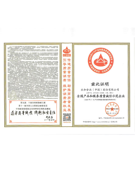 20243 月永和食品(中國(guó))股份有限公司榮獲全國(guó)產(chǎn)品和服務(wù)質(zhì)量誠(chéng)信示范企業(yè) -