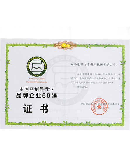 20235 月永和食品(中國(guó))股份有限公司榮獲中國(guó)豆制品行業(yè)品牌企業(yè)50強(qiáng) -