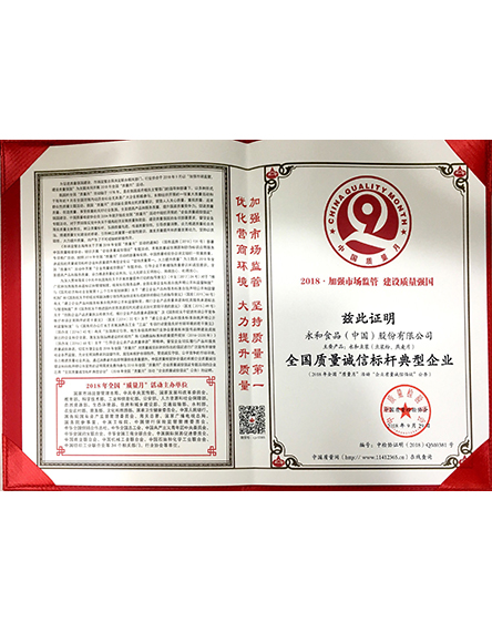 20189 月永和食品(中國(guó))股份有限公司榮獲2018全國(guó)質(zhì)量誠(chéng)信標(biāo)桿典型企業(yè) -
