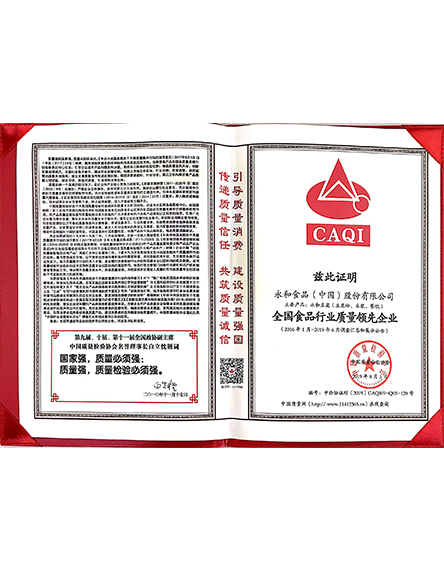 20198 月永和食品(中國(guó))股份有限公司榮獲2019全國(guó)食品行業(yè)質(zhì)量領(lǐng)先企業(yè) -