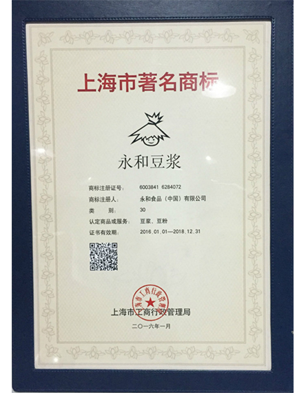20161 月永和豆?jié){榮獲上海市著名商標(biāo)