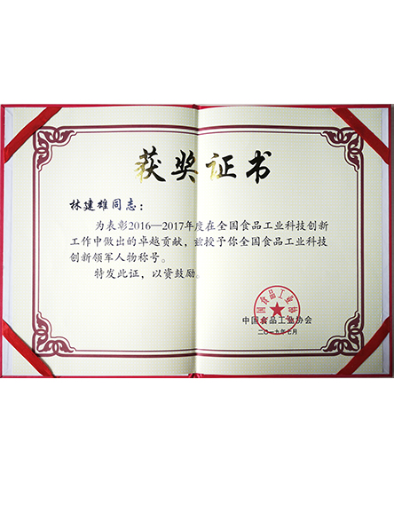 20197 月為表彰林建雄2016-2017年度在全國(guó)食品工業(yè)科技創(chuàng)新工作中做出的貢獻(xiàn),中國(guó)食品工業(yè)協(xié)會(huì)授予林建雄榮譽(yù)稱號(hào)和證書 -