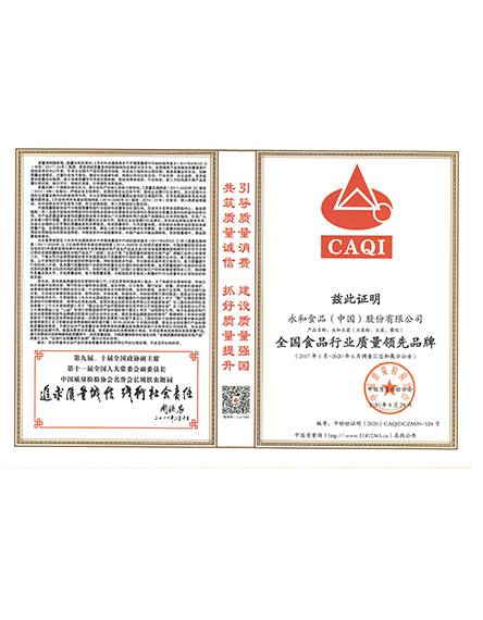 20232 月永和食品(中國(guó))股份有限公司榮獲全國(guó)食品行業(yè)質(zhì)量領(lǐng)先企業(yè) -