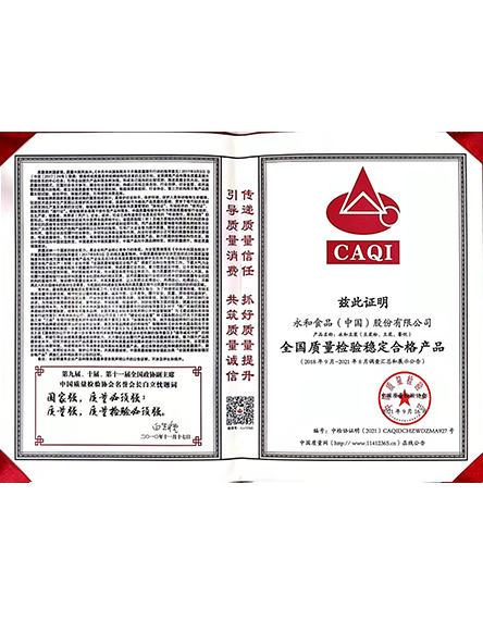 20219 月永和食品(中國(guó))股份有限公司榮獲全國(guó)質(zhì)量檢驗(yàn)穩(wěn)定合格產(chǎn)品 -