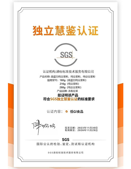 202311 月永和豆?jié){純豆?jié){粉通過(guò)SGS獨(dú)立慧鑒低GI食品認(rèn)證 -