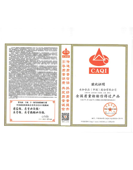 20232 月永和食品(中國(guó))股份有限公司榮獲全國(guó)質(zhì)量檢驗(yàn)信得過(guò)產(chǎn)品 -